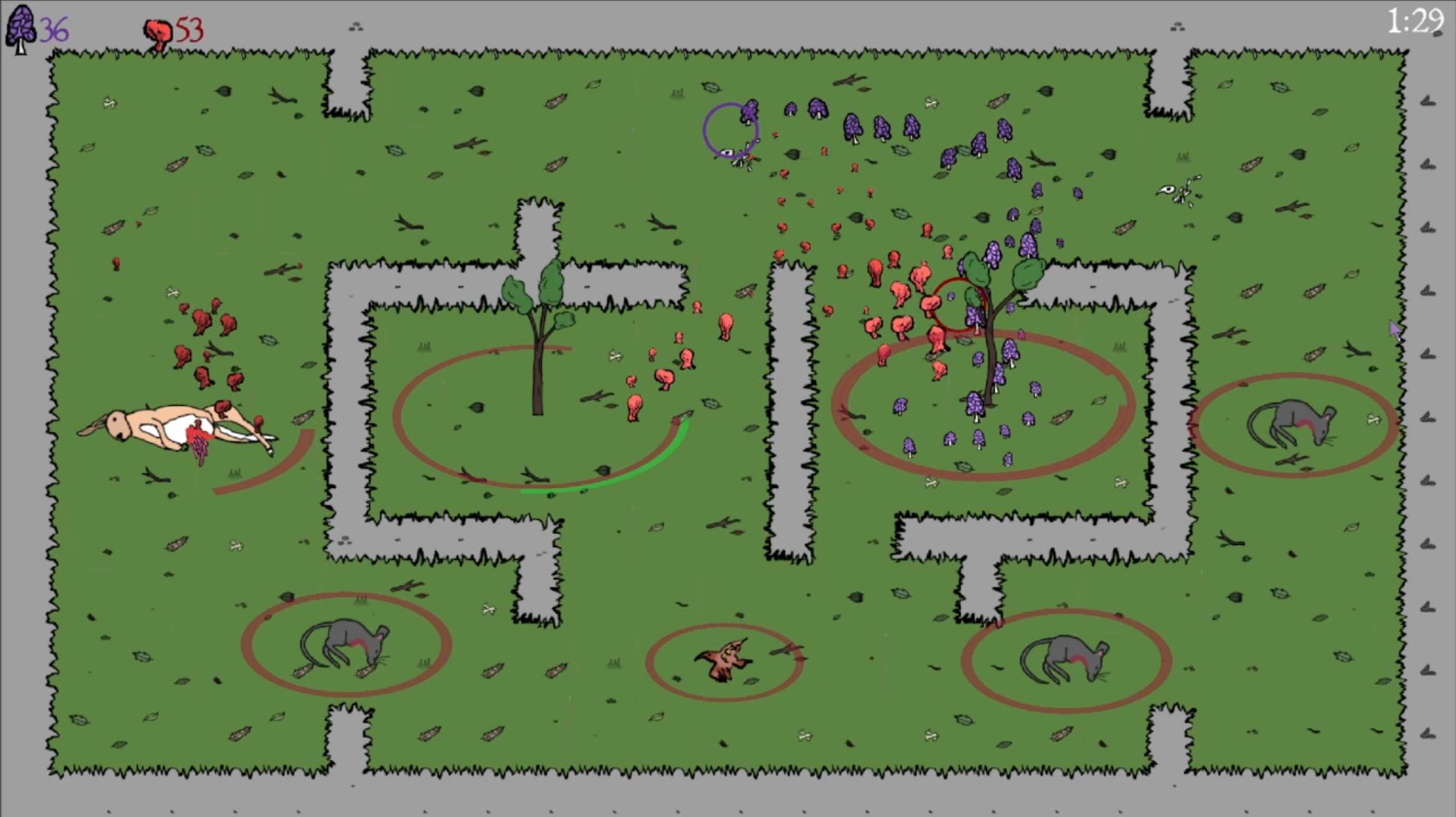 A 2-4 player PvP strategy game, where you control territory, symbiose with trees and eat animal carcasses!